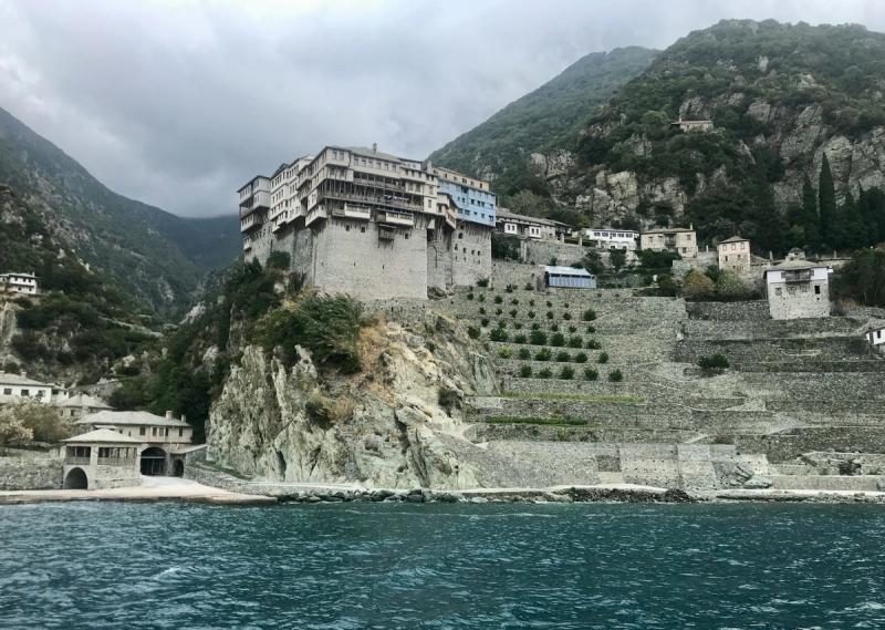 Ansamblu monumental cu cupole verzi, aproape de Dafni. Clopotniță impresionantă și bibliotecă cu texte slave. Ușor de vizitat în ziua sosirii sau plecării.